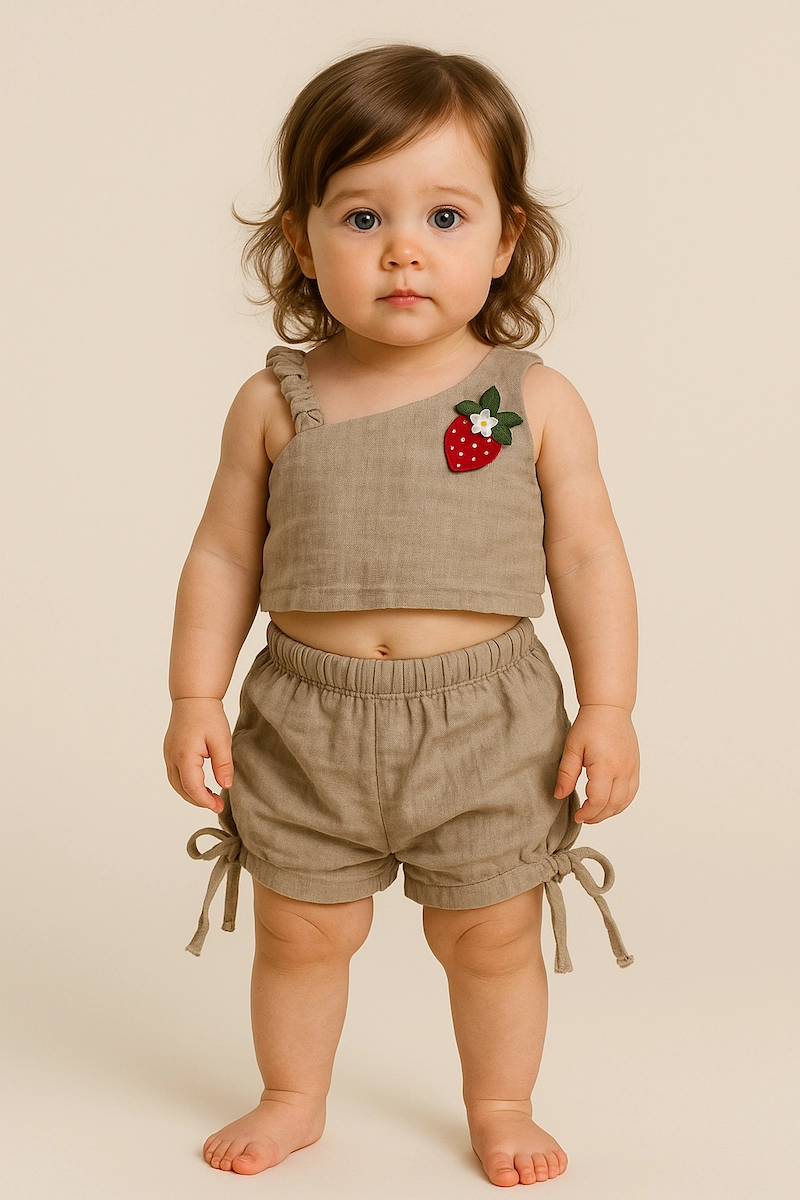 Cropped top με έναν ώμο, από απαλό βαμβάκι με ελάχιστες ραφές για λεία και άνετη αίσθηση στο δέρμα. Ασύμμετρο κόψιμο επάνω με όψη πλεξούδας και μονή ελαστική τιράντα στον έναν ώμο με διακοσμητική λεπτομέρεια. Σορτς με λάστιχο στη μέση, και σούρες με κορδόνια στα πλάγια.